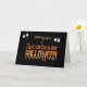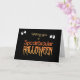 Une carte de "Spooktacular Halloween" avec le lettrage orange et jaune sur un arrière - plan noir et deux paires de yeux éffrayants scrutant hors de l'obscurité. Une conception numérique de Judy Adamson.