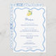 Ce design de menu fait partie d'une nouvelle collection basée sur ma gamme d'invitations populaires "Amalfi" au citron. L'invitation est simplifiée, avec une bordure ondulée, un simple citron avec des feuilles et un revers de carreau peint à la main en bleu et blanc. Là où se trouve le mot "menu", vous pouvez avoir le nom de l'invité à la place, de sorte que les cartes de menu puissent également servir de cartes de table.