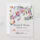 Carte de table de mariage avec feuille de défilement colorée sur fond rétro à motifs gris clair, présentant une feuille de défilement colorée aux couleurs de l'arc-en-ciel sur fond rétro à motifs floraux gris clair. Pliez la carte le long du centre.
