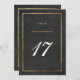 Cartes de numéro de table de mariage sur un effet de feuille d'or faux et blanc sur un fond noir subtilement texturé en tableau noir. Polices de caractères classiques script et serif. Veuillez noter que la feuille d'or est un effet imprimé - aucune feuille métallique réelle ne sera utilisée dans l'invitation.