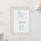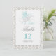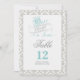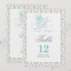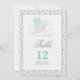 Numéro de table Il était une fois recto-verso avec un thème de conte de fées dans une palette de couleurs aqua, gris, blanc et noir sur un fond damassé.
