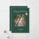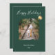 C'est une carte de vœux moderne et élégante avec un fond vert forêt profond. La partie supérieure de la carte affiche le message "Joyeuses Fêtes" dans un script calligraphique blanc et fluide. Un cadre distinctif à l'aspect de coup de pinceau artistique au centre contient une photo personnalisée (représentée ici par un couple sur des voies ferrées), donnant à l'image un bord peint et texturé. Un seul ornement à l'aquarelle dorée de style peint à la main est suspendu à l'extrémité du texte du script, ajoutant un accent métallique festif. La partie inférieure de la carte comporte un texte blanc propre et sans empattement indiquant "DE NOTRE FAMILLE" suivi d'une année fictive "202x".