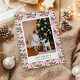 Carte de vacances avec un joli fond de papier peint rose pastel et vert avec une photo de famille associée à un vœu de vacances et votre nom et année dans une police sans serif.
