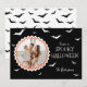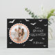 Envoyez vos vœux d'Halloween à votre famille et à vos amis avec une carte de vacances d'Halloween comportant des chauves-souris blanches, des textes et une photo à cadre blanc unique avec une touche d'orange. Motif de chauve-souris noire sur fond blanc au dos de la carte.