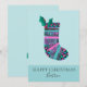 Un bas de Noël à motifs amusants en rose et turquoise avec un bouquet de saint. Le design est personnalisé avec un nom et un accueil, qui peuvent être changés tous deux. le design est assis sur un arrière - plan bleu clair à l'avant et à l'arrière et cela peut aussi être changé.