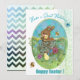 Cette jolie carte de vacances de Pâques présente un très mignon lapin de Pâques tenant un petit poussin entouré d'un pré avec beaucoup de fleurs sauvages colorées et un autre poussin qui erre à travers. Il y a également des bourdons qui volent autour.