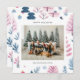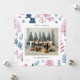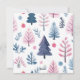 Carte de vacances avec des illustrations d'arbres de Noël mignons dans une palette de couleurs pastel, une photo de famille associée à un vœu de vacances et votre nom et année dans une police sans empattement.