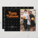 Bonne Carte de vacances photo Halloween. Souhaitez à vos amis et à votre famille une joyeuse Halloween avec ce carte photo unique. Cette conception comporte un motif éffrayant des deux côtés de la carte avec un arrière - plan noir. Customisez ce design en ajoutant votre propre photo et le texte de la carte. Exemple photo : Freepik.com