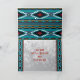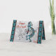 Personnalisez cette carte de Noël "unique" de Kokopelli du Sud-Ouest ! Elle présente un Kokopelli du Sud-Ouest turquoise jouant de la flûte avec des notes de musique sur un fond de Noël argenté avec des flocons de neige, entouré de bordures turquoise, rouille et noires et les mots édifiants... "Paix sur Terre" !