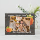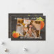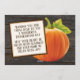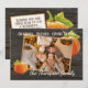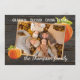 Unique, classe, tendance, jolie et décorative carte de vacances Thanksgiving. Joli don béni Merci texte et espace pour customiser ou personnaliser avec une photo et les noms (ou nom de famille) de votre choix. Avec de mignons citrouilles oranges classiques sur un look patiné gris rustique maison de ferme inspirée de planches de bois de barnwood design arrière - plan motif. Et une saison personnalisable saluant poème sur le dos de la carte.