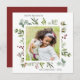 Cette carte de vacances carrée présente des baies rouges peintes à l'aquarelle, des branches de pin, de l'eucalyptus et des feuilles vertes avec les mots « Joyeuses Fêtes ». Personnalisez-la en changeant l'image avec votre propre photo et texte.
