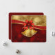 Magnifique conception de carte de vacances personnalisable avec des flocons de neige rouges et or et des cloches de Noël or avec un nœud ruban rouge.