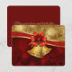 Magnifique conception de carte de vacances personnalisable avec des flocons de neige rouges et or et des cloches de Noël or avec un nœud ruban rouge.