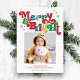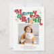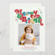 Ces cartes de fin de année de photo rétro de 5" x 7" présentent l'accueil lumineux et coloré "Merry & Bright", en rouge, vert, bleu et or et un message d'accueil modifiable, "Souhaitez-vous la paix, l'amour & la joie cette saison des Fêtes", avec un porte-monnaie pour votre photo préférée, et votre(s) nom(s) de famille.