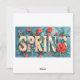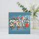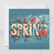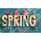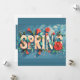 Une carte de vacances Spring vibrante entourée de nombreuses fleurs colorées épelées "Spring".