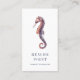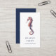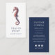 Les élégants cartes de visite verticaux de votre entreprise côtière présentent une illustration de hippocampe d'aquarelle avec votre nom et/ou nom d'entreprise en dessous. Personnalisez l'envers avec vos coordonnées, y compris trois icônes de médias sociaux et un champ de modèle pour votre nom d'utilisateur de médias sociaux, en blanc sur bleu marine.