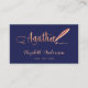 Un élégant carte de visite sur un arrière - plan bleu marine et un stylo en plumes d'or rose. Élégant script de style écrit à la main. Personnalisez et ajoutez Votre nom, titre, coordonnées et votre propre code QR à votre adresse de site Web.