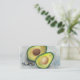 Aquarelle d'un avocat vert frais coupé en deux. Arrière - plan gris et bleu marbré.