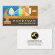 Un marteau en bois délimite une scène de paysage supérieure contre une couche brune inférieure. Le paysage en haut représente une scène domestique qui est en train d'être remodelée par une brosse à peinture. La bande de peinture de la brosse change toutes les couleurs qu'elle traverse. La scène ici peut représenter certains des services que vous pourriez offrir, par exemple la brosse peut représenter la peinture, remodelage, le cadre de maison peut être pour les réparations domiciliaires, l'arbre pour l'aménagement paysager et le marteau pour la menuiserie. Chaque représentation est laissée à votre propre représentation personnelle. Vers la base dans la couche brun foncé se trouve le titre de l'emploi "HANDYMAN" que vous pouvez changer et le contact téléphonique. À l'intérieur du marteau de bois, vous avez votre nom d'entreprise. Au-dessus, dans une couverture blanche, le logo du marteau d'or que vous pouvez utiliser est en haut. Ceci est suivi par votre nom prestigieux, les coordonnées et une option slogan slogan. Une grande carte créative pour tous à utiliser surtout ceux dans les réparations de maison, handyman, design d'intérieur et les entreprises de construction.