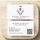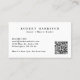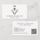 Carte de visite professionnel pour barbiers et barbiers qui présente une typographie moderne et une illustration abstraite d'un homme avec une coiffure, moustache et barbe, habillé en smoking formel avec un arc rouge, boutons et ciseaux formant les revers de son manteau. À l'arrière, ajoutez l'adresse URL de votre site Web pour créer un code QR numérisable pour vos clients afin de rechercher plus d'informations.