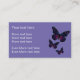 Modèle de carte de visite à thème papillon nature conçu avec trois beaux papillons colorés dans l'arrière - plan et disposition simple qui peut être customisé à votre façon. Créé pour une entreprise artisanale, le thème de la nature, les cartes de contact maman ou les services de baby-sitter.