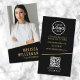 Photo contemporaine noir et or Code QR Logo Carte de visite vertical. Ce carte de visite vertical élégant est conçu pour les professionnels d'entreprise, les propriétaires de petites entreprises, les indépendants et les consultants qui veulent un look audacieux et moderne. L'avant est ornée d'un arrière - plan noir frappant avec des polices d'or et de blanc, mettant en évidence votre photo, le logo de l'entreprise, le nom, le titre ou le nom d'entreprise dans une mise en page pointue et professionnelle. Le dos poursuit l'esthétique noire avec vos coordonnées, un code QR scannable pour des connexions rapides, et des icônes de médias sociaux propres, jumelées avec l'expression "Connectez-vous avec nous !" dans un style poli. Le mélange de polices et d'accents noirs, dorés et blancs crée un design raffiné, élégant et polyvalent qui fonctionne pour n'importe quelle marque. Personnalisez le vôtre aujourd'hui pour une impression professionnelle et confiante !