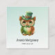 Cartes de visite avec une merveilleuse illustration fantaisiste. Un grand hibou brun aux yeux portant un chapeau vert et une cravate d'arc.