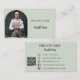 Un arrière - plan vert sage. Personnalisez et ajoutez votre titre, nom/nom commercial et texte à l'avant. Texte noir. Un cadre photo en arc. Retour : Modèles pour Votre nom, titre, numéro de téléphone, adresse postale et de site, votre propre code QR à votre site Web ou compte de médias sociaux. Image Facebook et Instagram/compte.