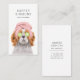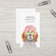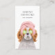 Un carte de visite mignon conçu pour les toiletteurs de chiens avec l'illustration d'un chien Charles King Spaniel recevant un traitement spa avec des tranches de concombre et un bandeau rose.