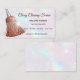Sparkle and shine while you clean! This unique business card features a fabulous rose gold glitter broom graphic against a dreamy, iridescent background. The "Classy Cleaning Service" script sets a professional tone, while the clear text ensures clients can easily find your contact and service details. It's the perfect way to make a memorable, glamorous first impression!