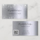 Un carte de visite élégant et séduisant sur un arrière - plan faux argent décoré avec de la poussière de parties scintillant fausse argent sur le devant. Élégant script de style en lettres à main noire. Personnalisez et ajoutez votre nom, votre titre et vos coordonnées. Ajoutez votre propre code QR à votre site web.