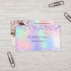 Un arrière - plan holographique tendance en rose, violet, vert menthe. Décoré de confettis violets. Personnalisez et ajoutez votre nom, titre, photo, numéro de téléphone, courrier, adresse du site Web, code qr à votre site Web. Lettres violettes.