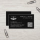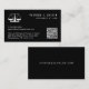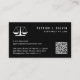 Carte de visite professionnel noir minimaliste et élégant pour avocats et professionnels du droit avec une illustration des échelles de justice et de votre nom, titre (avocat, conseiller, associé, etc.) et des coordonnées (tels que email, numéros de téléphone, nom de l'entreprise et adresse postale) en lettres propres, simples et modernes. Entrez une adresse URL pour créer un code QR numérisable lié à votre site Web, profils de réseaux sociaux ou toute autre plate-forme qui présente votre travail, ce qui facilite l'exploration de votre expertise par d'autres personnes. Au verso, customisez du texte supplémentaire ou laissez vide.