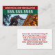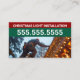 Customisez vos propres cartes de visite d'installation de lumière de Noël en plaçant votre nom d'entreprise ou message en rouge et vert avec votre numéro de téléphone au-dessus de la photo de quelqu'un sur une échelle mettant des lumières de vacances en hiver.
