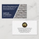La couverture comporte un mur en brique avec une couche de trapèze bleu sur la gauche. Voici le nom de l'entreprise, ses coordonnées ainsi que votre nom prestigieux et votre titre de poste près de la base de la carte. En surplomb, dans une couverture blanche, un logo doré domine que vous pouvez utiliser est en haut. Il est suivi par votre nom prestigieux, les coordonnées et un slogan-slogan que vous pouvez changer. Cette carte serait idéale pour ceux qui travaillent la maçonnerie et la construction. #mason #masonrycontractant #stonemasoney #brick #bricklay #brickwork #building #construction #handyman #homerepair #zazzlemade