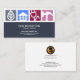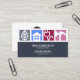 La carte comporte une conception deux à colonnes. La colonne blanche supérieure est accentuée par quatre logos colorés de service. Elle énumèrent certains des services offerts par l'entrepreneur. La feuille est pour l'aménagement, la maison pour des travaux de construction, le point de prise pour des travaux de M&E et finalement le marteau pour la menuiserie. Vos détails de carte sont énumérés à la colonne bleu-foncé ci-dessous. Votre nom et fonction sont au dessus. Ceci est suivi des détails de raison sociale et de contact.