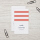 Design carte de visite moderne et chic dans un format vertical unique, avec trois larges bandes de corail sur un arrière - plan blanc, avec votre nom et nom d'entreprise ou titre dans un joli mélange de serif minuscule et de caractères casquette modernes. Ajoutez vos coordonnées complètes à l'arrière en bleu marine classique. Convient à toute profession; exemple pour les professions designs d'intérieur.