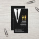 La carte présente un simple costume texturé en tissu noir avec un ensemble de couverts en faux or dans la poche de poitrine.