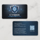 This modern cyber security business card features a bold, high‑tech design created for IT professionals, security analysts, penetration testers, ethical hackers, and digital protection specialists who want a strong, trustworthy first impression. The front showcases a sleek metallic shield with a keyhole icon, surrounded by circuit‑board graphics and clean digital lines that instantly communicate data protection, network security, and advanced technology. A powerful blue and silver logo, giving the card a premium, authoritative look that stands out in the cybersecurity and IT services industry. The dark background, metallic accents, and futuristic layout create a polished, professional aesthetic that reflects expertise in threat detection, system hardening, vulnerability assessments, and digital defense solutions.