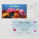 Ce carte de visite annonçant une pépinière de dahlia comporte un bouquet dramatique des dahlias dans des couleurs brillantes de rouge-foncé, d'orange, de rose, de jaune et or contre un ciel bleu pur.