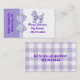 carte de visite à thème mignon avec un arrière - plan violet et blanc, avec des graphiques de en vichy ruban violet et blanc et d'arc entre les deux couleurs. Les graphiques d'un caniche mauve à l'air doux et souple décorent le côté blanc supérieur de la carte, avec du texte mauve personnalisé sous elle. Le texte personnalisé mauve s'exécute de côté, sur le côté violet plus clair de l'avant. Un motif à damiers violet et blanc, à l'arrière de la carte, correspond au ruban et à l'arc, à l'avant, et le texte personnalisé est prêt à être personnalisé. Personnalisez cette carte amusante pour votre entreprise.