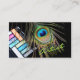 Conception de carte de visite de maquilleur avec la plume de paon et la palette colorée de fard à paupières sur l'arrière - plan noir. Cette carte élégante de profil est parfaite pour les filles à la mode, les esthéticiens, les cosmetologists, les salons de beauté de cheveux et de maquillage et d'autres professions semblables. Si vous avez besoin de n'importe quelle aide avec cette conception, sentez-vous libre pour me contacter.
