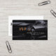 Ce carte de visite mécanique à thème foncé présente un profil foncé d'une voiture noire brillante. Votre nom d'entreprise et votre texte/slogan apparaissent dans une bande de panneau de texte noir qui s'exécute de l'icône de gauche vers le bord droit de la carte. Vos coordonnées apparaissent en bas à gauche au dos de la carte. Conçu pour les thèmes automobile, automobile, transport, mécanique.