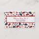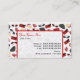 Un carte de visite à thème mode aux couleurs rouge et noir. Le design se compose de porte-monnaie noirs avec pois blancs, de porte-greffe rouge avec arc noir, de rubis rouges, d'une bouteille de parfum avec atomiseur rouge, et de lunettes de soleil de chat rouge et noir. Personnalisez le texte à l'avant et à l'arrière avec vos coordonnées.