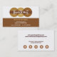 Trois bagels graphiques sont représentés sur ce carte de visite. Ils s'impriment l'un l'autre avec une légère transparence et un panneau avec le nom de l'entreprise traversant les trous. Les couleurs dorées imitent les bagels avec des points ajoutés pour ajouter la suggestion d'un bagel de sel et de graines de pavot. L'information Customisée s'imprime ci-dessous contre le brun riche. Utilisez l'inverse comme carte de récompense pour la fidélité de votre client. Disponible avec les produits correspondants.