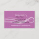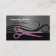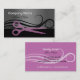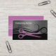 Conception de carte de visite géniale. Motif rose de ciseaux et une illustration tourbillonnante de cheveux sur l'arrière - plan.