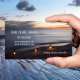 Un beau carte de visite romantique avec des lumières sur la plage au coucher du soleil. Idéal pour un voyagiste, un agent de voyages ou une entreprise spécialisée dans les lunes de miel ou les mariages de destination. Vous pouvez également l'utiliser comme carte d'insertion pour votre mariage pour indiquer votre site Web mariage.