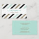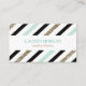 Carte de visite rayé très élégant avec parties scintillant or, menthe et bandes noires sur un arrière - plan blanc et un nom avec titre sur un rectangle horizontal au milieu. Toutes les informations sont au dos avec menthe arrière - plan, police élégante en ton or.