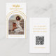Design Modern Script Photo QR Code Photographie Photographe Carte de visite dispose d'un script doré élégant et élégant avec votre photo préférée dans des arcs dorés avec vos détails d'affaires et le site Web professionnel personnalisé QR code au verso. Au verso, vous trouverez vos coordonnées personnalisées. Personnalisez en modifiant le texte dans la zone de texte fournie. Conçu par ©Evco Studio www.zazzle.com/store/evcostudio