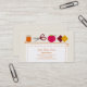 Un carte de visite d'ouvrière couturière comportant des illustrations d'une bobine de fil orange, de ciseaux, d'un coussin de goupille, et des échantillons de tissu. Personnalisez avec votre nom et information.